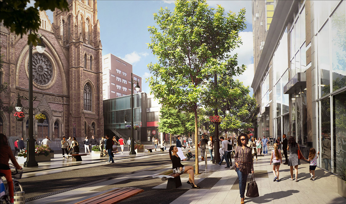 En 2019, c’est un espace mixte qui a droit à une sérieuse cure de Jouvence (projet de 50$ millions) offert par la municipalité. Ainsi, la taille du Square Phillips passera de 2300 m2 à 3110 m2, soit une augmentation de 35 %. Le projet prévoit aussi plus de verdure. Le nombre d’arbres passera de 19 à 90 à terme. La taille des parterres floraux sera aussi augmentée. Ces îlots seront bordés de maçonnerie pour servir de bancs.