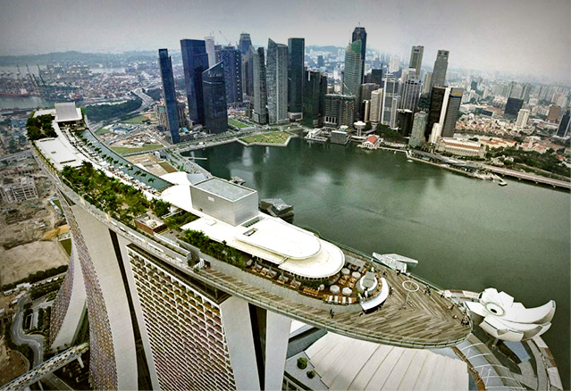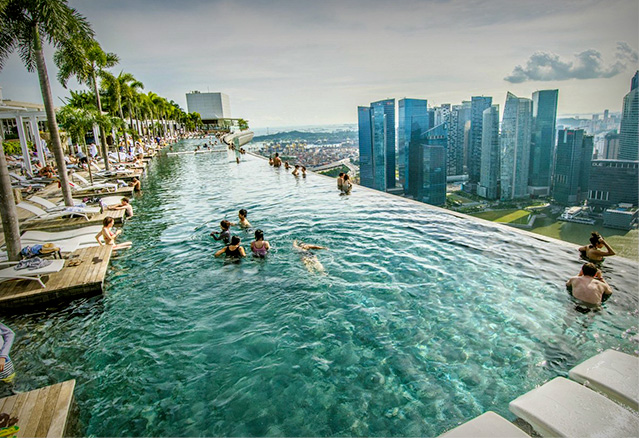 Complété en 2010 à Singapour, le célèbre projet figure parmi les plus dispendieux hôtels du monde. Le complexe comporte entre autres un immense jardin aérien qui semble être en équilibre sur les trois tours. L’équipe de Safdie Architects a choisi ici de réinterpréter le concept d’infinite pool de manière gigantesque. Construite sur une distance de 150 mètres, l’immense piscine extérieure promet une expérience et une vue hors du commun…