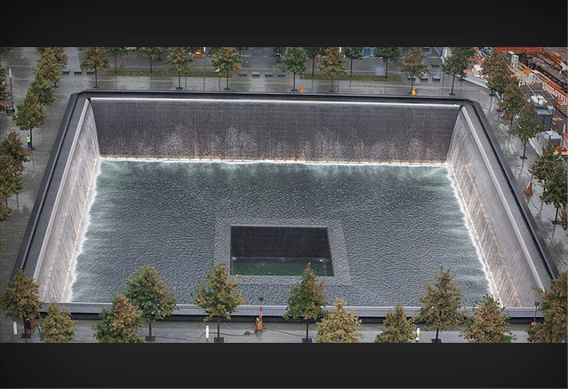Gagnant d’un concours en 2003 et complété en 2011, le concept du mémorial en hommage aux victimes des attentats est sobre mais très symbolique. La place publique se compose de deux bassins de 30 pieds de profondeur et d’un aménagement paysager conçu par l’architecte paysager Peter Walker. Les deux bassins créent un volume négatif dans l’empreinte des deux tours et sont gravés du nom de chacune des victimes. Le soir, des lumières projettent deux volumes fantomatiques rappelant les tours. La célèbre firme BIG architects a d’ailleurs dévoilé son concept pour la nouvelle tour du 2 World Trade Center il y a environ un mois. À surveiller…