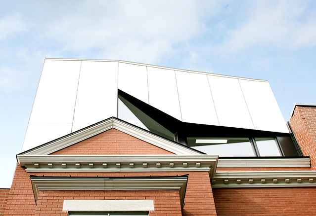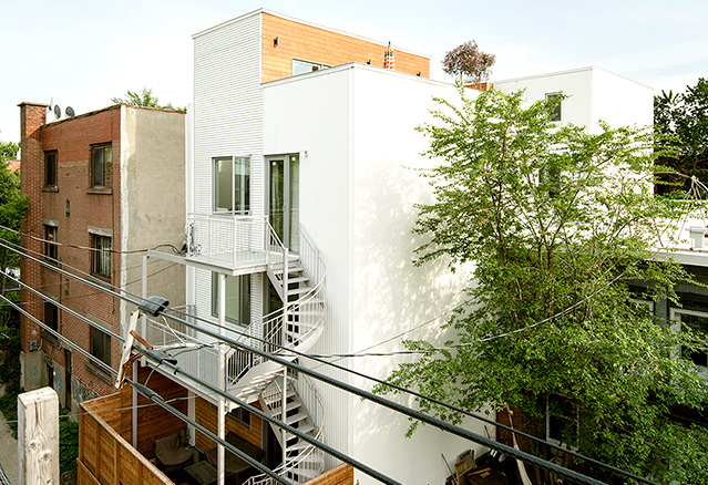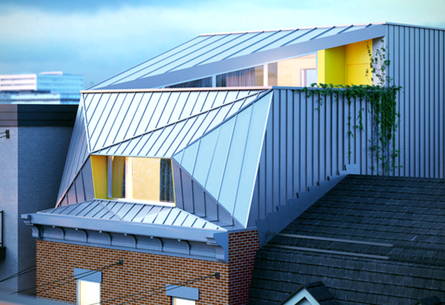 La rénovation initiale du projet, situé sur le Plateau Mont-Royal, vise d’abord la rénovation du duplex existant, touchant entre autres à la maçonnerie et à la corniche, typiques du patrimoine architectural du quartier. La seconde phase du projet, quant à elle, n’a rien de typique. Flouant la limite entre l’architecture contemporaine facettée et son côté historique, l’étage ajouté en toiture rappelle avec habileté les toits mansardés et les lucarnes d’autrefois. Pour contrôler l’impact visuel du geste architectural, Architecture Open Form dépose le volume en prenant soin de laisser un recul par rapport à la façade datant du début du 20ème siècle. Finalement, le volume est plié, tordu et perforé de manière à maximiser l’éclairage naturel ainsi qu’à conserver les points de vue intéressants sur le quartier.