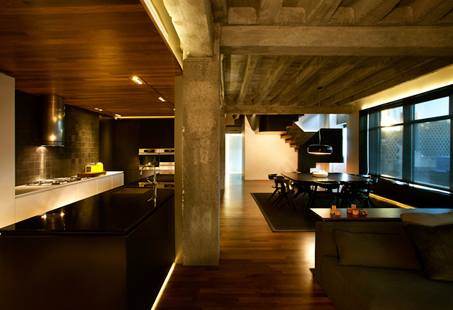 Réalisé en 2012, le projet Penthouse A offre une ambiance hors du commun, entre autres grâce au souci particulier du choix de finitions intérieures, en plus des points de vue spectaculaires sur la ville. L’architecte choisit ici de laisser l’impressionnante structure de béton apparente, donnant ainsi un caractère plus industriel au penthouse. Plusieurs éclairages encastrés sont habilement dissimulés, de manière à accentuer les lignes directrices du projet. Donnant accès à une incroyable toiture-terrasse (probablement l’une des plus impressionnantes de la ville), l’escalier de bois aux courbes séductrices est l’un des éléments les plus remarquables du projet.