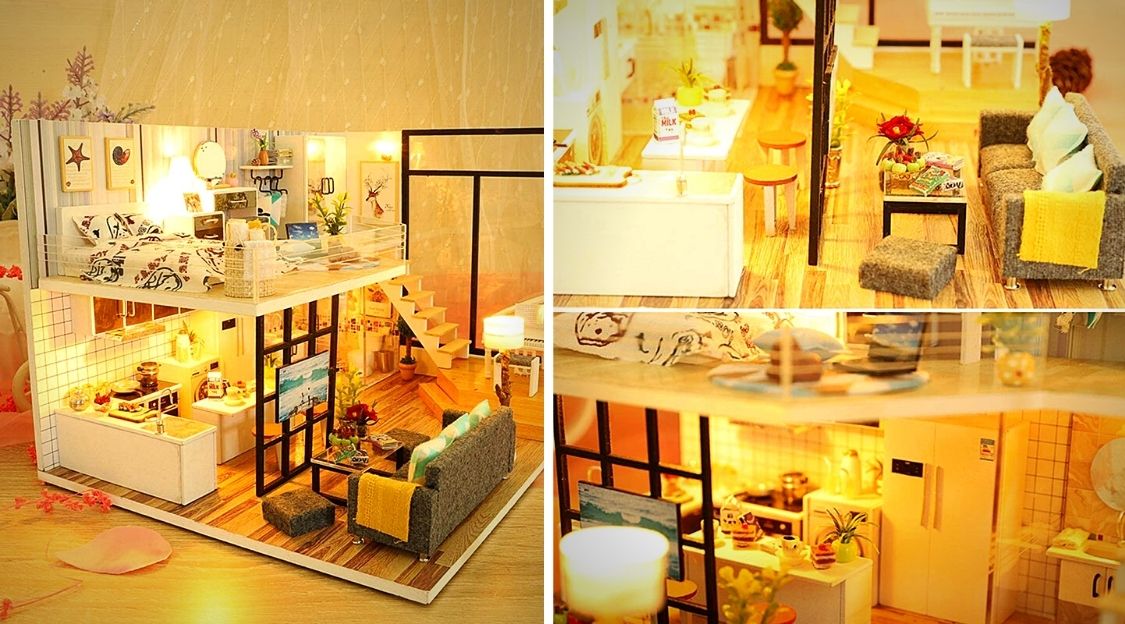 Cette maison miniature en bois à échelle 1:24 sera définitivement un cadeau significatif pour celui ou celle qui la recevra. Son décor moderne et réaliste inclut plusieurs objets, dont des livres, des vêtements et même des lumières. Parfaite pour des moments de partage intergénérationnels et une touche décorative originale.