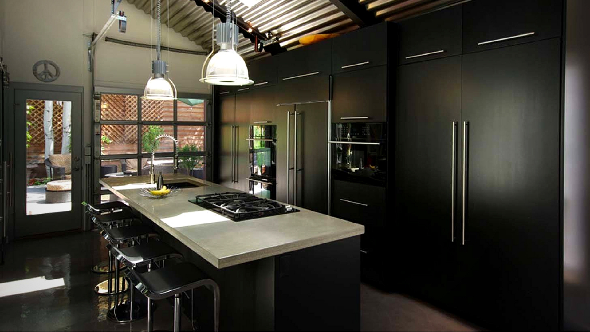 Les créateurs de la cuisine suivante ont été très audacieux. Presque tout est noir, du plancher au plafond. L’effet d’ensemble qui en résulte est à la fois sobre et raffiné. Chaque élément de couleur dans la pièce, un fruit ou un instrument de cuisine est mis en valeur. La grande ouverture adjacente permet d’éviter que ce ne soit trop sombre.
