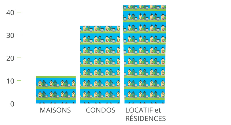 On observe une relance au niveau de la mise en chantier de projets immobiliers dans la région métropolitaine. Dans le secteur du locatif, cette hausse s’explique de deux façons. Premièrement, le vieillissement de la population incite plusieurs promoteurs à développer des complexes pour retraités afin de satisfaire la demande éventuelle. Deuxièmement, le développement de complexes de condos locatifs répond à la demande des nouveaux arrivants ainsi que des jeunes de moins de 25 ans (qui sont locataires dans une proportion de 44%). En somme, l’engouement pour les propriétés neuves est bien présent autant pour les condos que pour les maisons.