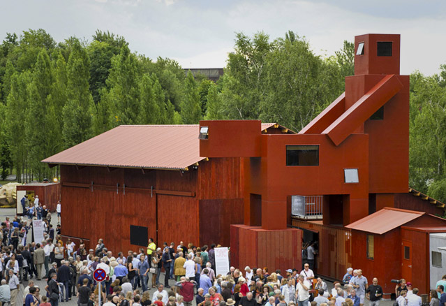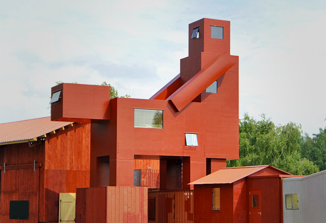 Les bâtiments comprenant comprenant sculpture, bâtiments et aménagement paysager exploitent la dualité entre humour noir et réalité frappante. La couleur rouge laisse place à l’imagination tandis que les textures bois et acier offrent un contraste frappant.