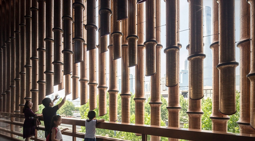 La façade mouvante de ce centre culturel de Shanghaï est d’une beauté remarquable! Imaginé par les firmes Foster + Partenaires et Heatherwick Studio, l’extérieur du bâtiment est constitué de trois couches de tubes de bronze suspendus qui bougent lentement. Ils évoquent ainsi la traditionnelle ouverture de rideau dans les théâtres chinois, en plus de rappeler le bambou, un matériau traditionnel. De l’intérieur, les visiteurs profitent de vues variées et découvrent le bâtiment sous un nouvel aspect à chaque visite!