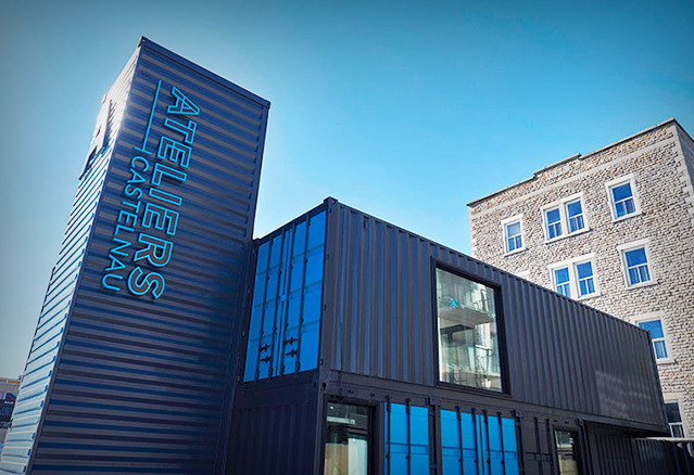 L’utilisation de quatorze conteneurs était toute désignée pour donner à ce bureau des ventes situé dans le Mile-Ex un fini bien à lui. Ils évoquent le passé industriel du lieu qui abritait autrefois une imprimerie, tout en conférant au bâtiment un aspect contemporain et distingué. Le bâtiment abrite le bureau de ventes et l'unité modèle du projet Ateliers Castelnau, ainsi que des espaces de démonstration du travail d’artisans.