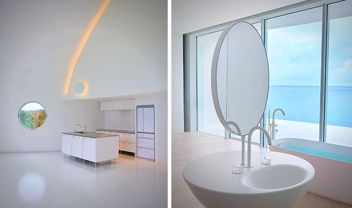 Cette demeure est l’espace studio de Mariko Mori et, à bien des égards, une extension directe de son travail artistique. Sa forme sphérique a été inspirée par le corail blanchi (un malheureux effet du changement climatique) qui s’échoue fréquemment sur les rivages. L’étage supérieur donne sur une petite récolte de roches océaniques, qui rappelle à Mori le temple Ryoan-ji à Kyoto, célèbre pour son jardin de pierres zen où Mori a médité à plusieurs reprises. Enfin, il y a une chambre principale au rez-de-chaussée, deux chambres d’amis et une salle pour les cérémonies du thé, une autre tradition japonaise que Mori a incorporée dans sa propre pratique artistique, avec des récipients à thé futuristes et d’autres ustensiles.