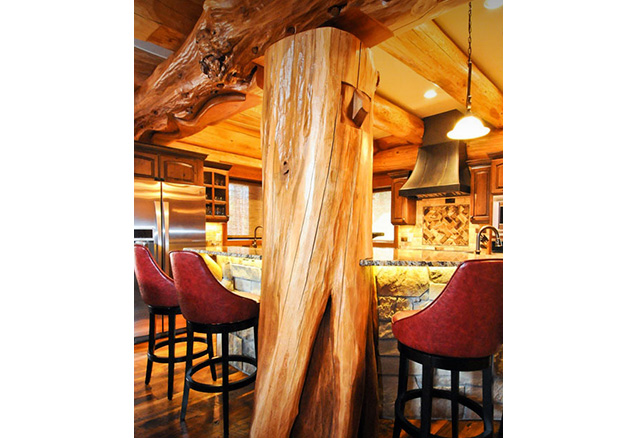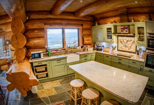 Werkhaus n’est pas le seul bureau qui utilise des billots dans les cuisines. C’est une tendance assez répandue. La compagnie de Colombie-Britannique Pioneer Log Homes en utilise autant pour les comptoirs que les que les poutres, colonnes et murs. Complètement différent du minimalisme contemporain de Werkhaus, ces espaces très chargés sont chaleureux et rustiques.