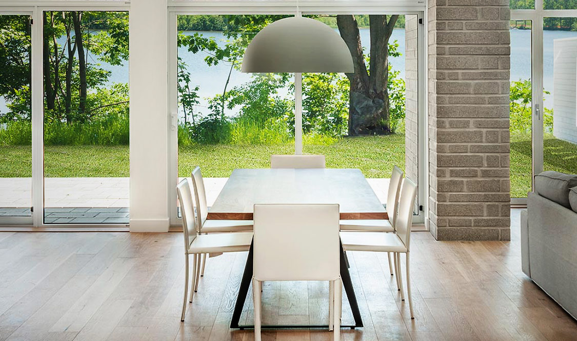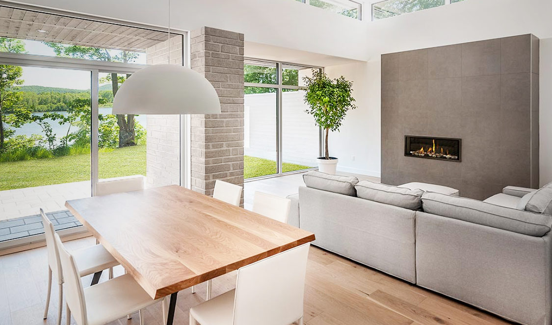 La relation avec l’environnement est véritablement au cœur du projet. « Nous avons cherché à minimiser les barrières entre l’intérieur et l’extérieur afin d’offrir une vie en symbiose avec la nature », nous a affirmé la représentante des ventes du projet, Marie-Andrée Dubois. En effet, une fenestration abondante, orientée plein sud fait face au lac et permet de se sentir comme si on était à l’extérieur. La vue est splendide. De nombreux arbres matures ont d’ailleurs été conservés dans le projet. « Nos arbres, on les aime d’amour. Nous venons nous assurer qu’ils se portent bien à chaque année. Nous en avons seulement coupé quelques-uns pour assurer une vue vers le lac ».