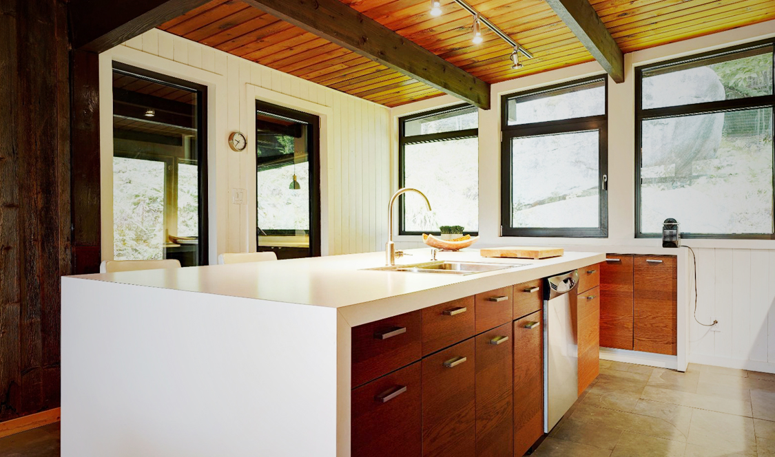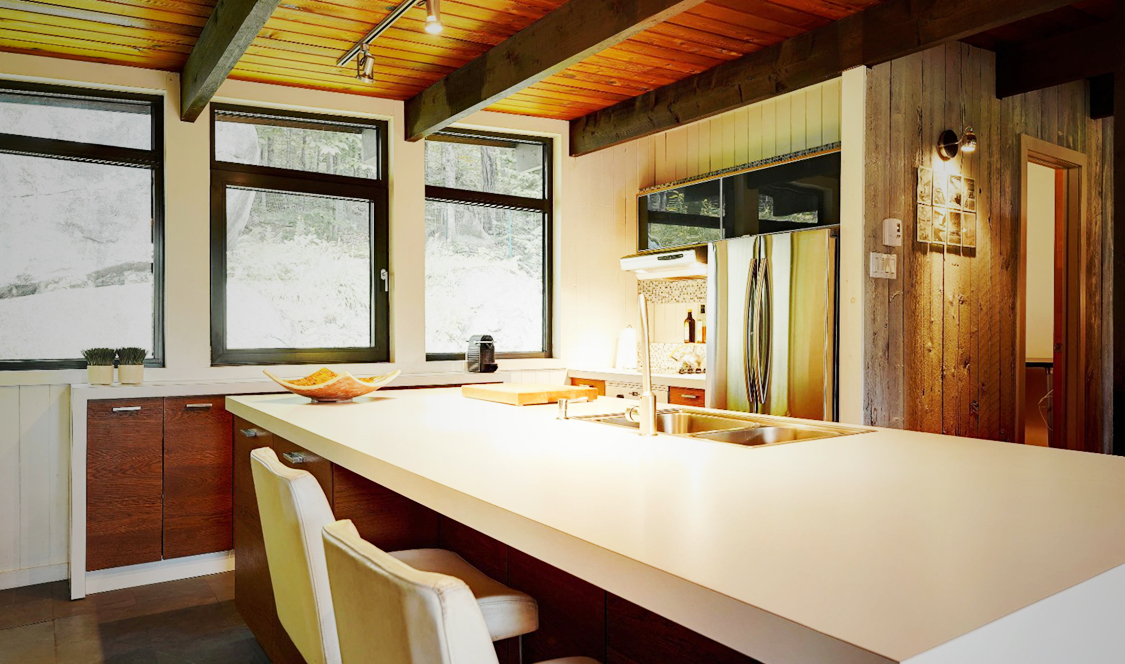 La maison mid Century modern s’ouvre sur la nature grâce à une fenestration exceptionnelle. Bien qu’ayant quelques années sous son revêtement, celle-ci a fait l’objet d plusieurs rénovations au fil du temps. Outre le toit qui a été méticuleusement refait, la cuisine a désormais un caractère contemporain qui joue assez bien avec le caractère architectural inhérent des années ´50.
