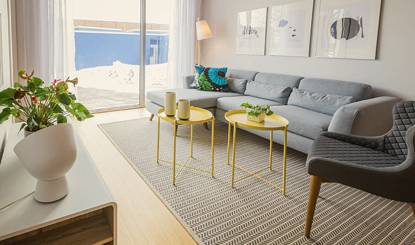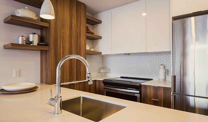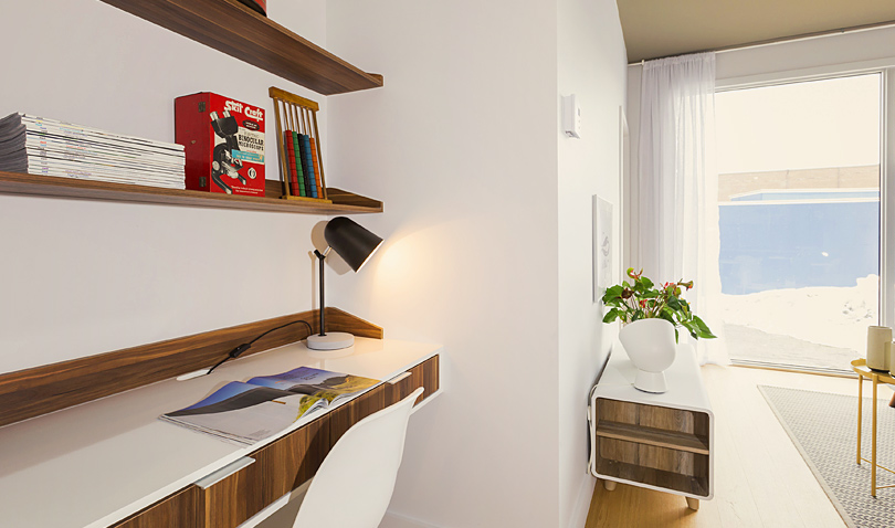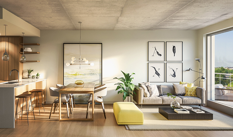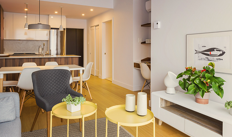Du côté des unités, le design affiche une pureté dans les lignes, plusieurs unités s’ouvrent sur le paysage, on y respire la liberté. Des plafonds de neuf pieds et une importante fenestration laissant généreusement place à la lumière extérieure donnant ainsi une dimension grandiose aux espaces.