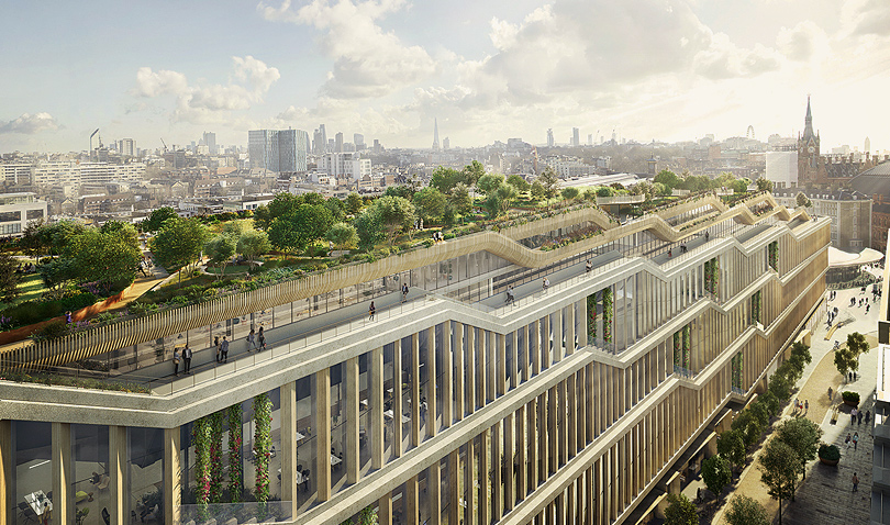 - Google King’s Cross à Londres, grande structure sur les toits de Google qui laisse place à l’humain et un verdure imposante.