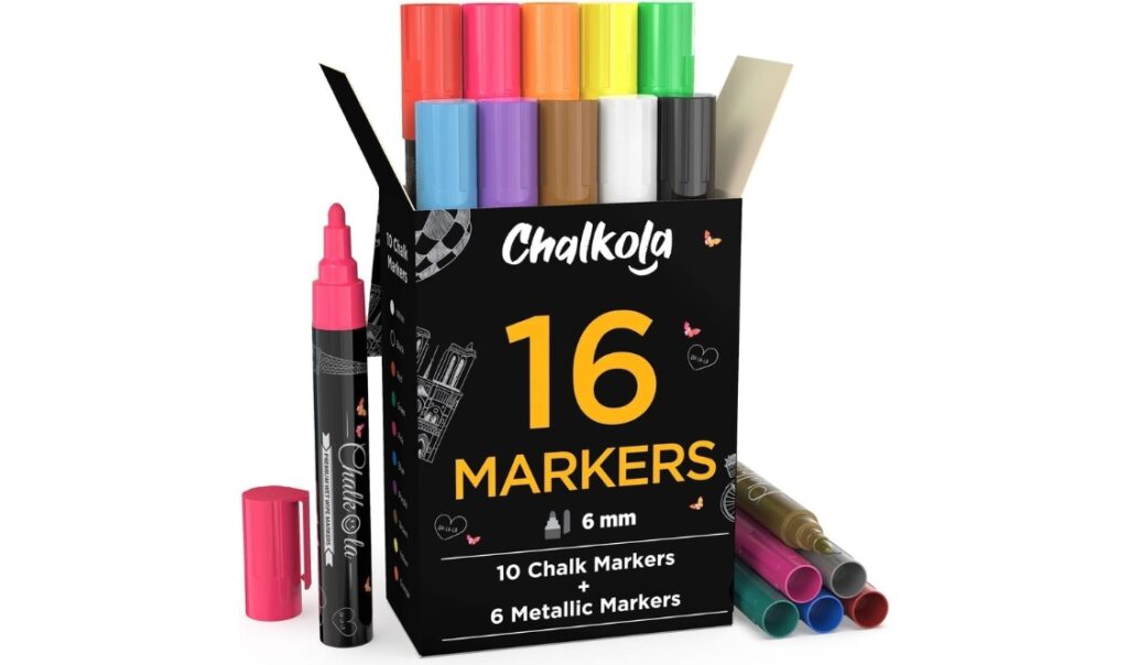 Le lot de 16 marqueurs à craie liquide Chalkola offre une solution pratique et colorée pour décorer diverses surfaces. Ces marqueurs effaçables à l’eau, disponibles en 10 couleurs néon et 6 couleurs métalliques, conviennent aux tableaux noirs, fenêtres, miroirs et autres surfaces non poreuses. Leur encre à base d’eau est idéale pour remplacer les anciennes craies poussiéreuses, offrant une écriture fluide et sans désordre. Faciles à effacer, ces marqueurs permettent de créer des messages et des designs temporaires sur des surfaces comme le verre, le miroir et le tableau. Parfaits pour un usage domestique ou professionnel.