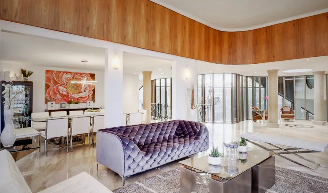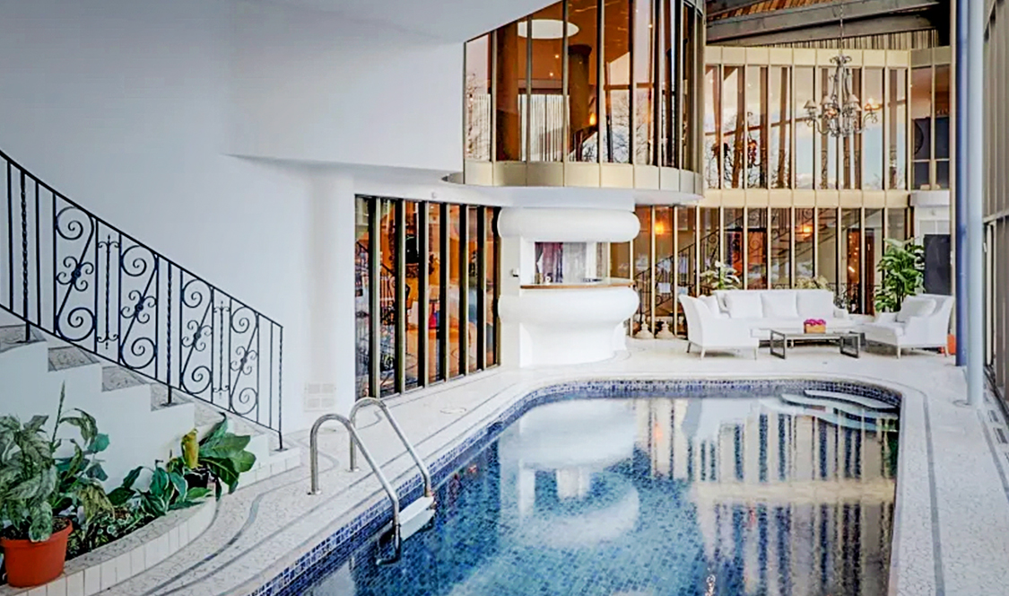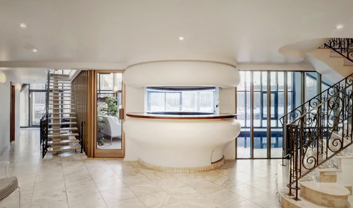 Le hall principal reflète d’emblée l’architecture caractérielle des années 1970, hauts plafonds, dorures et rondeurs sont à l’honneur. Cernée par un mur de verre, une piscine intérieure de 34 pieds avec des plafonds de 24 pieds de haut crée une profondeur et un ensoleillement inégalés. De l’autre côté du hall, le salon vitré offre un grand espace de divertissement, une salle à manger et une belle cuisine traditionnelle avec balcon donnant sur le jardin. Cette résidence offre 5+1 chambres et 5+1 salles de bain, plus son propre étage privé avec une chambre principale et des quartiers privés.