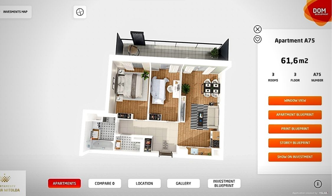 Le moteur interactif de recherche permet de chercher une habitation selon différents critères de sélection tels que le prix, le nombre de chambres ou de pieds carrés, ce qui améliore grandement l’expérience client et la rapidité de recherche. De plus, le promoteur immobilier peut choisir un style de mobilier personnalisé pour chacun de ses projets. Ainsi, une vue 3D est disponible pour chaque unité qui se voit meublée! D’autres fonctionnalités telles qu’une carte qui permet de découvrir les lieux intéressants dans le voisinage et un outil de comparaison sont également intégrées à l’application.