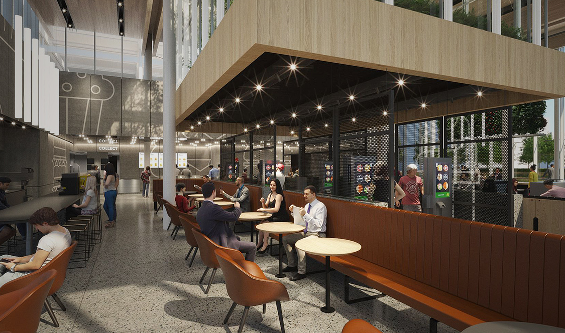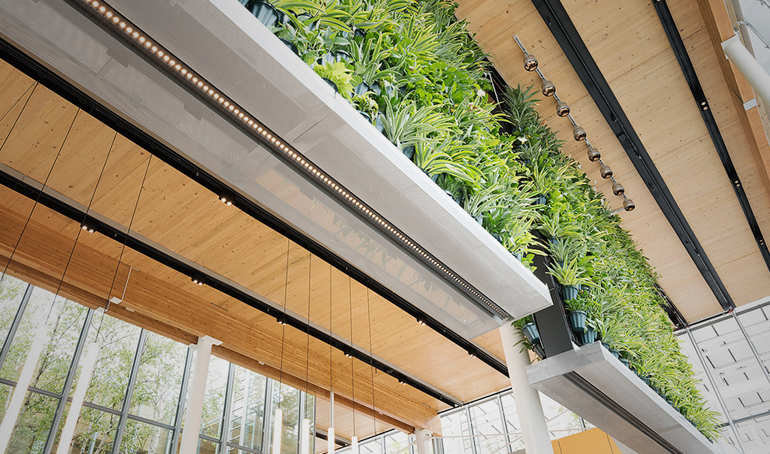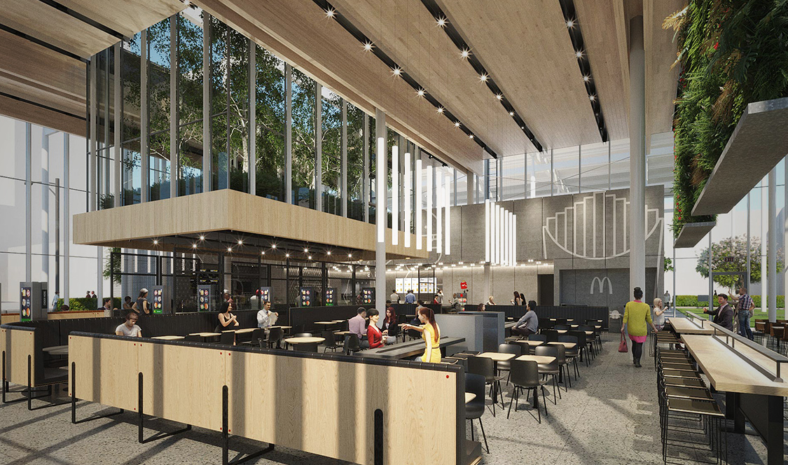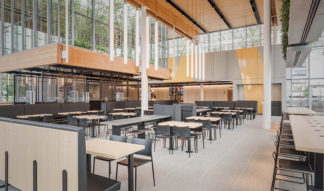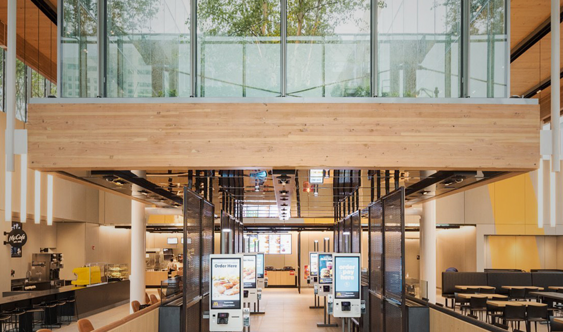 Ce nouveau McDonald n’a que 19 000 pieds carrés et une seule pièce, par contre, le plafond atteint 27 pieds de haut. Du bois lamellé-croisé constitue le toit du bâtiment et a été laissé exposé en dessous, créant une atmosphère chaleureuse. Des plantes vertes ont été intégrées sur tout le site du projet ainsi qu’à l’intérieur du bâtiment. Les clients peuvent manger sous des murs verts verticaux. Un toit vert, au milieu du restaurant, permet aux clients de jeter un coup d’œil sur le potager central, parce que tout comme à Montréal, on essaie de verdir nos cités. Et la beauté de la chose c’est que le MacDonald est ouvert 24 heures sur 24!