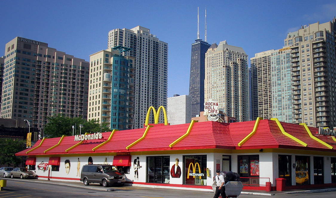 Chicago est une ville surprenante, entièrement détruite par le Grand incendie de 1871, elle a su projeter l’image d’une ville contemporaine et originale. Principalement composées de bâtiments à quelques étages, elle a vu apparaître des immeubles plus grands et plus originaux suite à ce triste événement. Cet élan de construction a vu naître plusieurs projets significatifs et surtout, une signature propre à la ville. Ainsi, le Rock ‘N Roll McDonald’s, un restaurant étonnant y a facilement trouvé sa place.