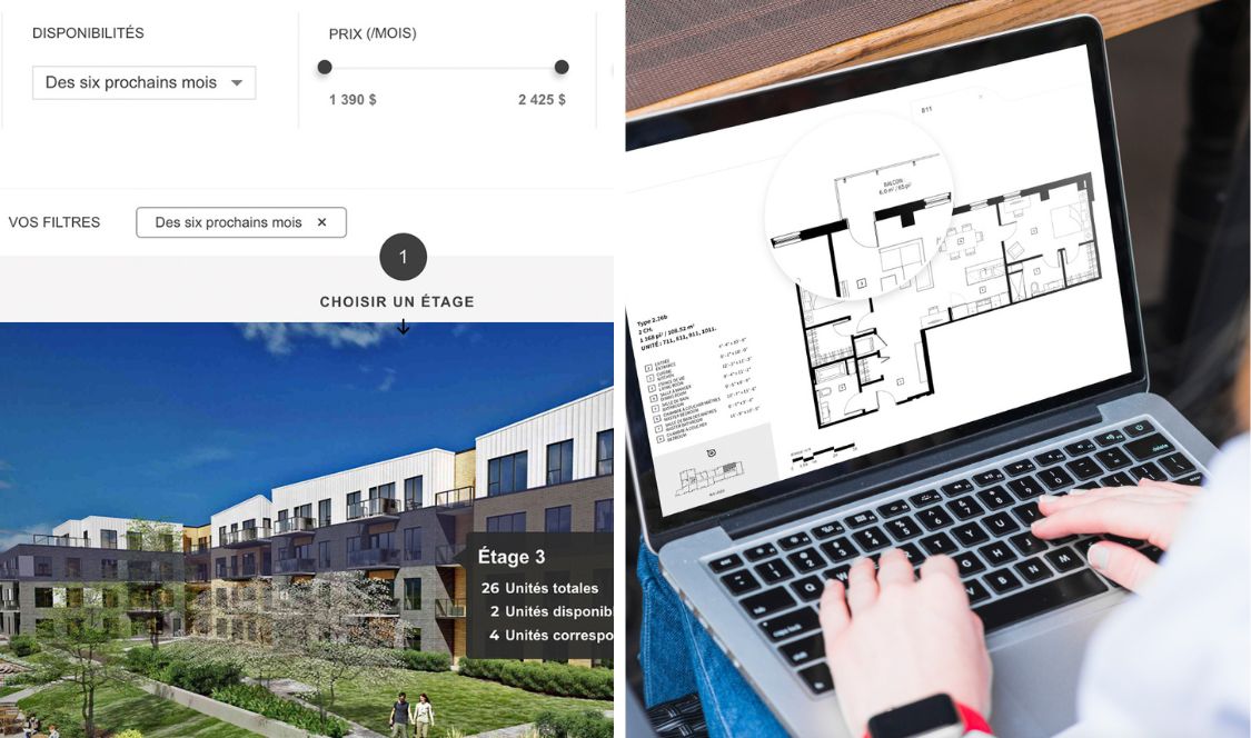 Ainsi, la qualité et la quantité d’information disponible sur un site web est devenue un enjeu de taille quand vient le temps de faire la mise en marché d’un projet immobilier. Les rendus 2D et 3D, les visites virtuelles et les plans des unités sur Internet permettent aux futurs occupants de se projeter dans les lieux et apportent de la crédibilité aux complexes immobiliers.