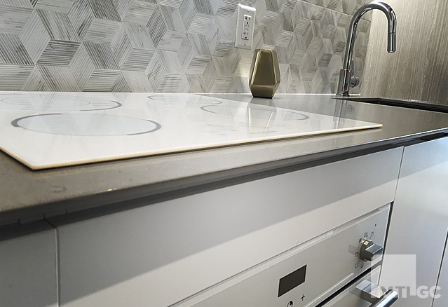 Des comptoirs de quartz suspendus, des électros qui se fondent littéralement dans le décor, une cuisine « sleek ».
