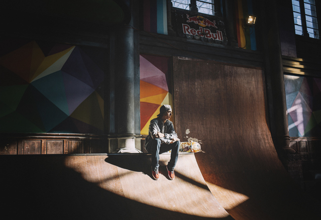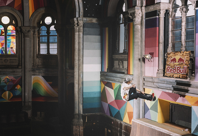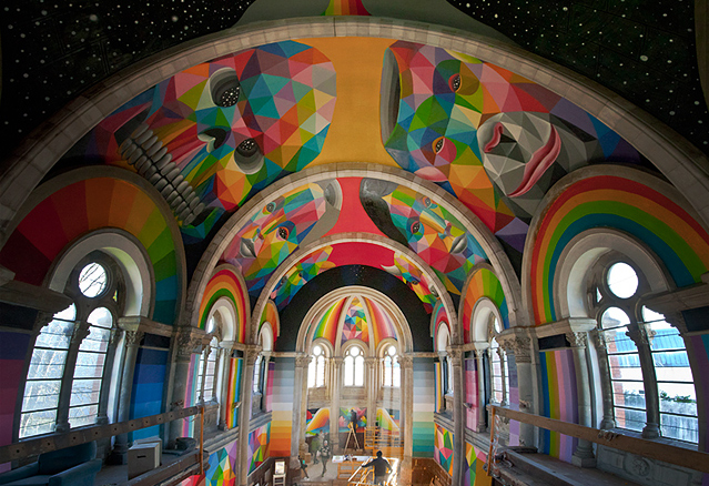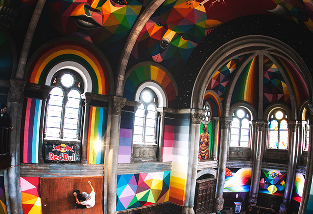 Okuda San Miguel, peintre espagnol s’est attaqué à un antre de la religion vieux de 100 ans. En effet, l’Espagne, comme le Québec, se retrouve avec des lieux de prière désuet et abandonnés. La municipalité de Llanera de 13 000 habitants au nord de l’Espagne s’est laissé tenter par la proposition de transformer son église en espace dédié au skate board. L’église, érigée en 1912, était abandonnée depuis depuis des années, a attiré l’attention de l’investisseur Fernández Rey. Ce dernier ne trouvant pas comment rentabiliser un commerce dans le dit édifice puisque la crise faisait rage en Espagne, s’est plutôt tourné vers sa passion, le skate board… en espérant y faire ni plus ni moins qu’un lieu de dévotion au … skate.