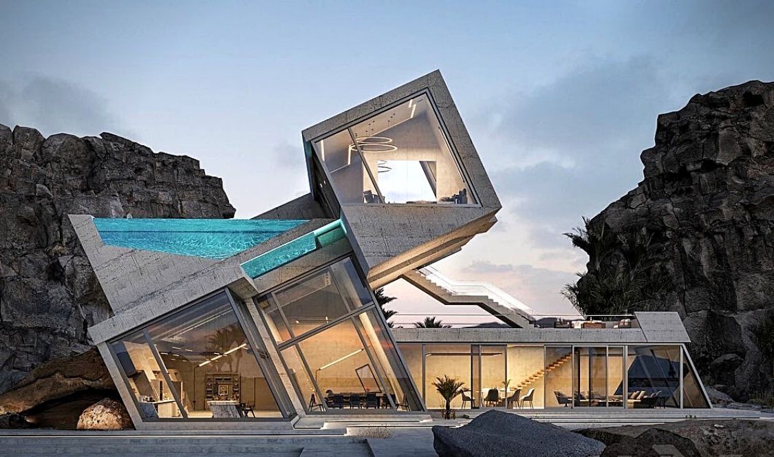 Le bâtiment a la forme d’un conteneur renversé dont les côtés sont remplacés par une vitre panoramique, garantissant une vue à 360 degrés sur la plage depuis le rez-de-chaussée. La créativité du design se manifeste non seulement dans l’inclinaison du bâtiment, mais aussi dans la terrasse où les résidents peuvent apprécier l’incroyable paysage pendant qu’ils dégustent leur café aux premières heures du matin. Construite en 2022, cette maison laisse place à la beauté de la nature avec un intérieur épuré et de grandes fenêtres.
