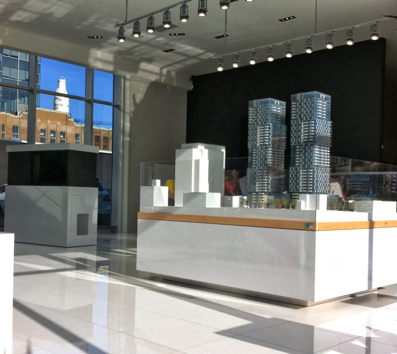 La première tour à été mise en vente le 28 septembre 2013, dans un bureau de vente où luxe et opulence sont au rendez-vous. À l’accueil, un énorme stationnement asphalté couvert de longues lignes blanches rappellent aux visiteurs le tarmac d’un aéroport. À l’intérieur, un long fauteuil blanc, une maquette, un grand comptoir, des fenêtres pleine hauteur et quatre écrans forment un ensemble épuré, un ensemble pour nous préparer au décollage…